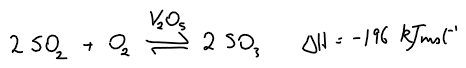 Sulfur dioxide reacts with oxygen (equilibrium process above) with the aid of a Vanadium (V) Oxide catalyst to form sulfur trioxide.
