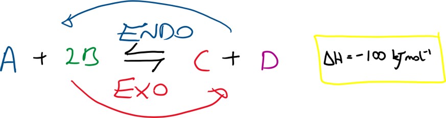 If the temperature is increased then the system will shift to counteract the change and so will attempt to decrease the temperature by favouring the side of the reaction that produces less heat, i.e. the endothermic reaction and so producing more of A + 2B. The position of equilibrium shifts to the left (i.e. more reactants are formed as the backward reaction is favoured).