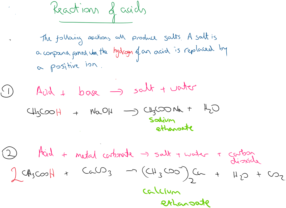 As they are acids they will react in the same way as standard acids, although not with the same intensity as they are weak acids. e.g. Ethanoic acid reacts with sodium hydroxide to form its salt (sodium ethanoate) and water. They can react with metals to form salt and hydrogen and react with metal carbonates to form a salt, carbon dioxide and water.