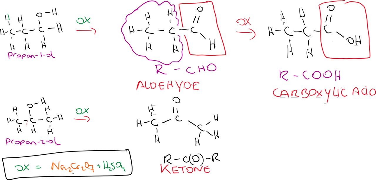 The main reactions that are necessary to know for L.C. chemistry is the reaction with an acid to form an ester in a substitution reaction (see ester section below), the dehydration of an alcohol to from an alkene in an elimination reaction (see alkene formation) and the oxidation of alcohols to form aldehydes, ketones or carboxylic acids.