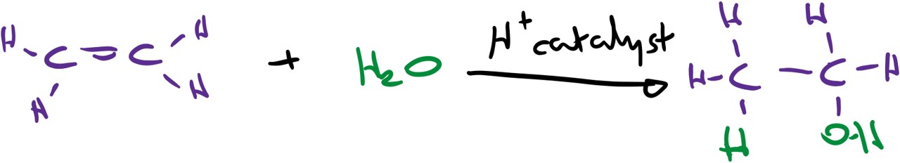 A hugely important class of compounds, it is important to know how to make the most common alcohol, ethanol, and understand some of its reactions. There are two common methods of formation. The quickest and most efficient is the hydration of ethene, where water is added to ethene using an acid catalyst (phosphoric acid usually).