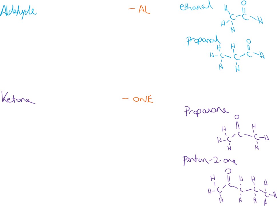 Ketones are much like aldehydes but the carbonyl group is 'internal' and not on the end of a carbon chain. Hence the smallest ketone is propanone (3 carbon atoms), that and butanone are the only ones on the L.C. course. Their physical properties and chemical reactions are similar to aldehydes. They can be reduced to alcohols using Hydrogen and a Nickel catalyst, which is also used to make alkanes from alkenes (this reduction of carbonyls is more popular on the mark schemes than the usual sodium borohydride or lithium aluminium hydride).