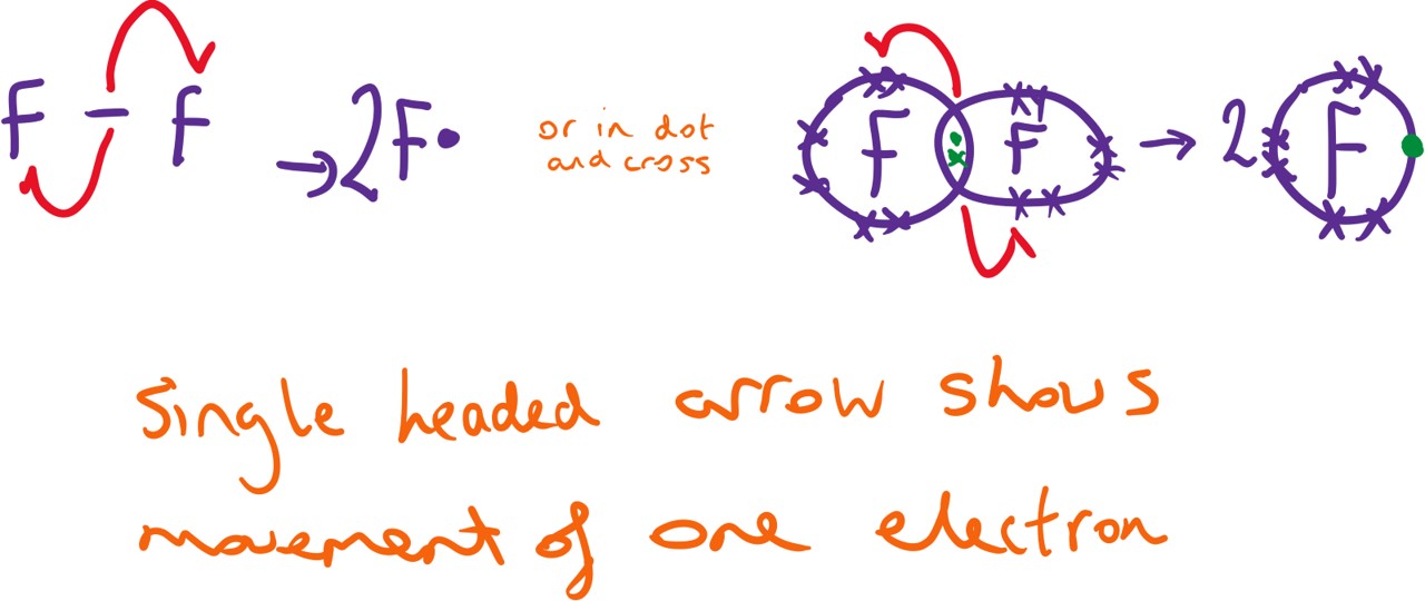 Homolytic fission is where there is an even breaking of the covalent bond in which both atoms regain one electron to form a species known as a free radical.