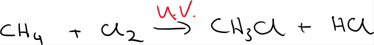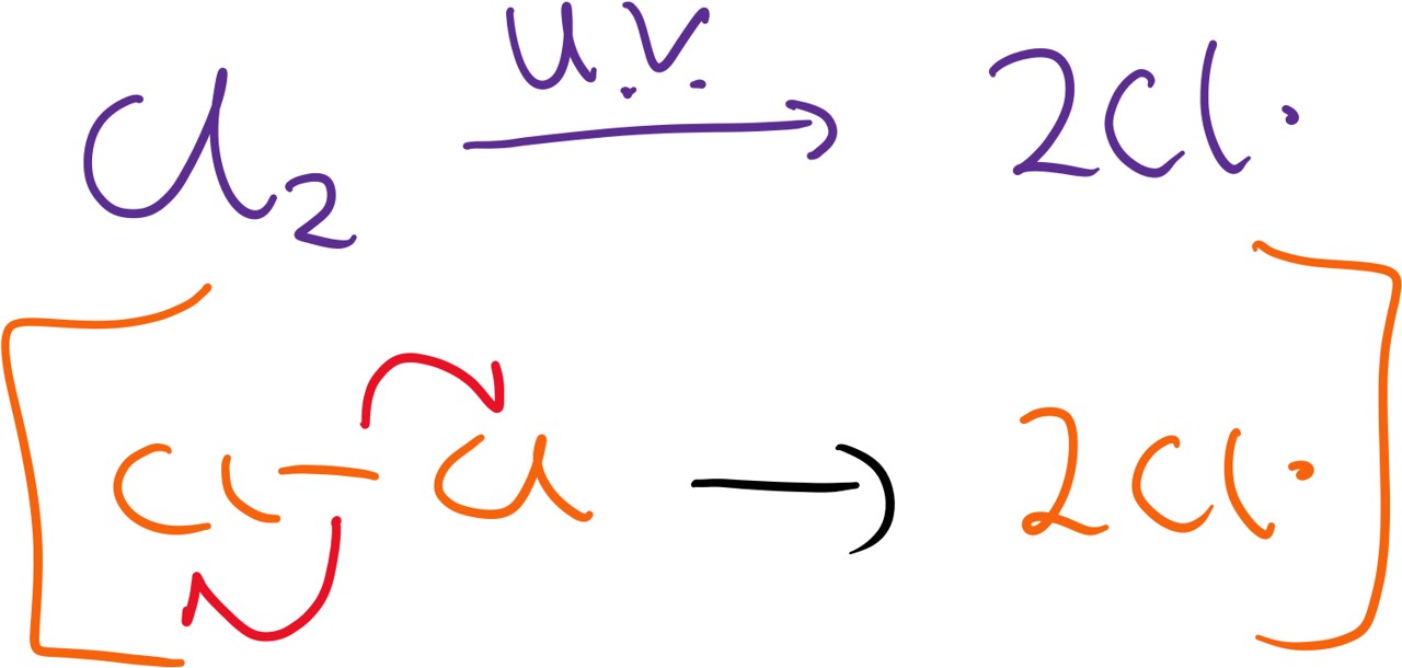 It starts with an initiation process where by ultra-violet (UV) light causes a chlorine molecule to split apart by homolytic fission.