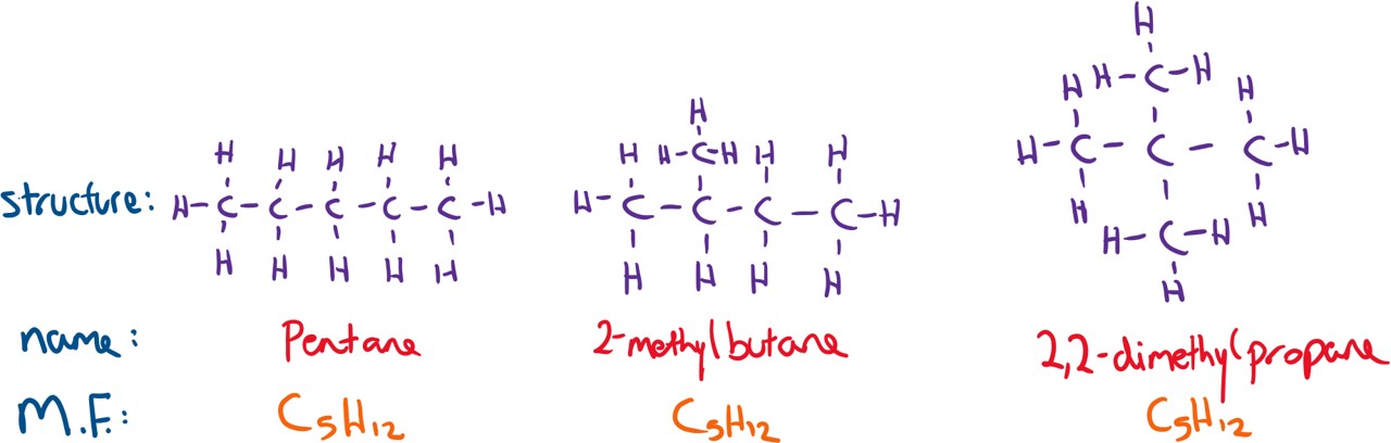 Structural isomers are molecules that have the same molecular formula (same number and type of atoms) but different structural formula (different arrangement of atoms). For example, the following are structural isomers of a molecule called pentane.