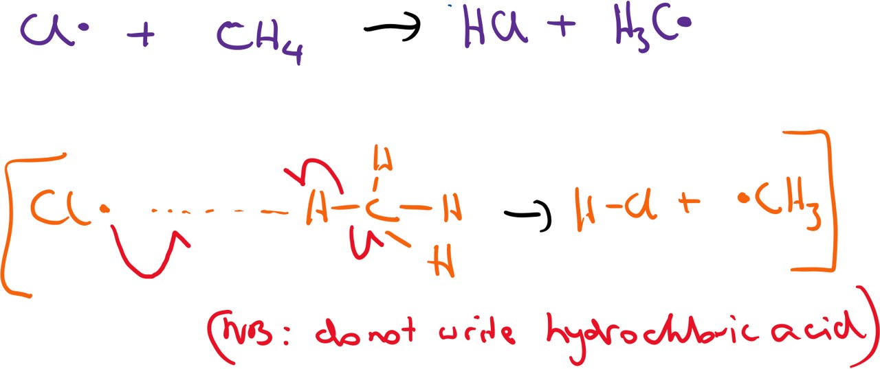 The chlorine radical then extracts a hydrogen atom from a methane molecule, forming a new H-Cl bond and breaking a H-C bond to from a methyl radical.