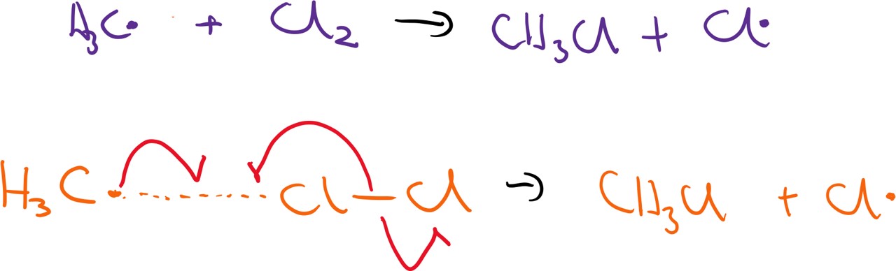 The following is the mechanism for the free radical substitution reaction of methane with chlorine. (Note: only the purple depictions below are necessary for LC chemistry, the orange writing is an aid to understand what actually happens).