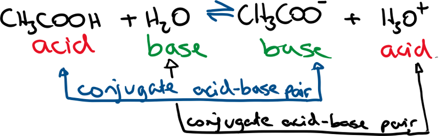 Conjugate pairs form because when an acid loses a proton, it becomes a base in the reverse reaction and when a base gains a proton, it becomes an acid in the reverse reaction. An acid-base reaction is an equilibrium between two acid-base conjugate pairs.