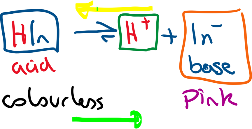 Above is an equilibrium depiction for phenolphthalein. As this is an equilibrium, if acid is added to the indicator solution, the position of equilibrium shifts to the left (yellow arrow) and the solution becomes colourless. As alkali is added, the H+ concentration decreases and so the position of equilibrium shifts to the right (green arrow) and the solution becomes pink (pale purple).