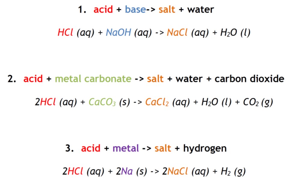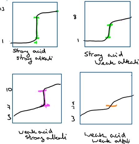 In each of the reactions above, the completion point occurs at a different pH, due to the amount of alkali (hydroxide ions) added at the point of reacting with all of the hydrogen ions. An indicator will only work if the pH at which it changes colour (its range) coincides with the equivalence point in each reaction (mid point of the above vertical ranges).