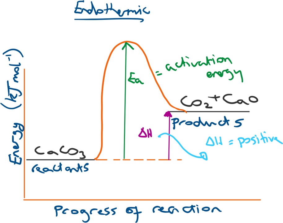 For an endothermic energy profile diagram the products will have a higher energy than the reactants and so the overall change in energy (ΔH) will be positive (thus energy is taken into the system from the surroundings, resulting in heat loss).