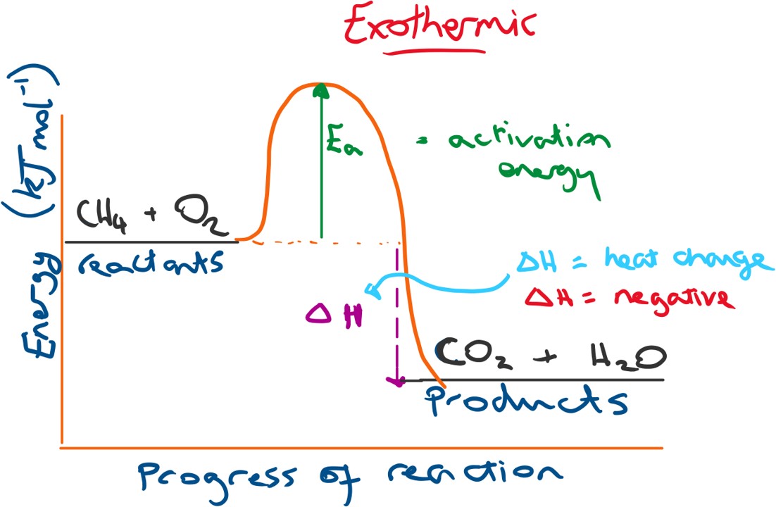 Below is a profile diagram for an exothermic reaction. The change in energy (ΔH) will be negative because the products have a lower energy than the reactants.