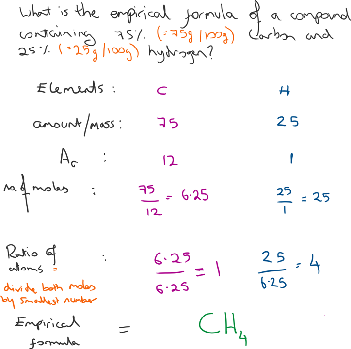 To work out the empirical formula of a compound, you need to compare the number of moles of each element present in the compound. Therefore, to do this you first take the percentage or (mass in g) of each element present to work out the number of moles of each. Divide the number of moles of each element by the smallest value (number of moles) as this will will result in the simplest whole number ratio.
