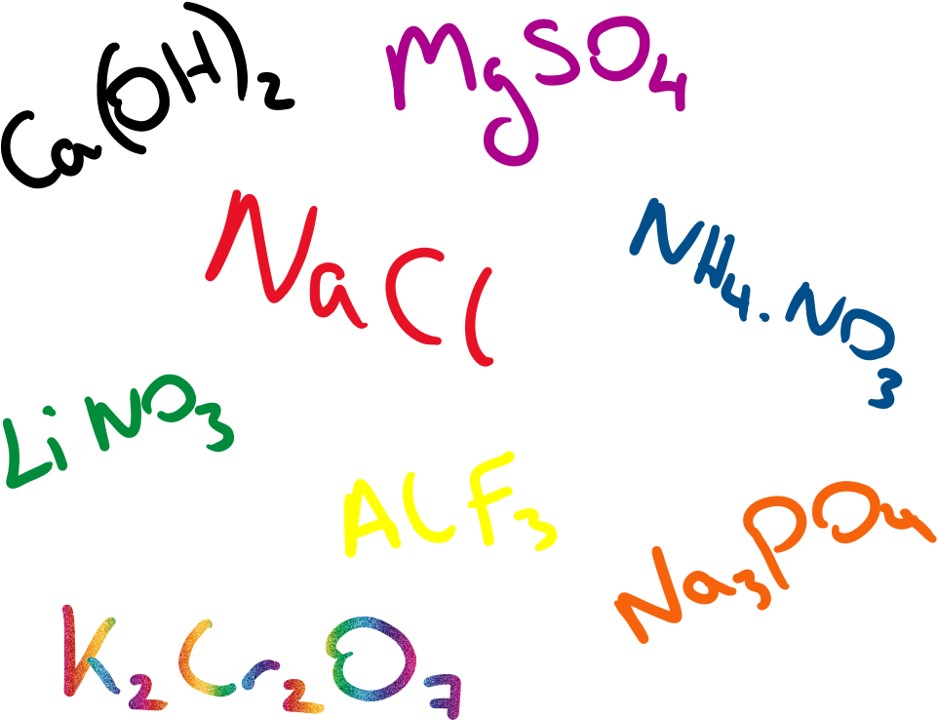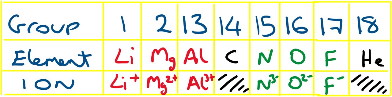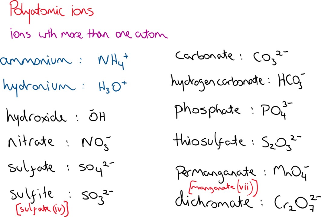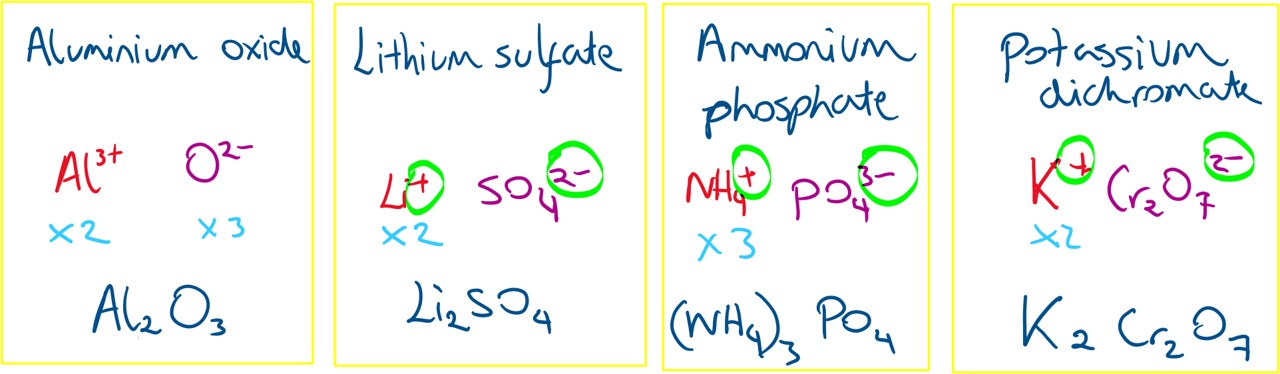 To work out the (empirical) formula for an ionic compound you first need to write each ion and its associated charge. The ions can be simple ions found by using the table below or polyatomic ions which are to be learnt off.
