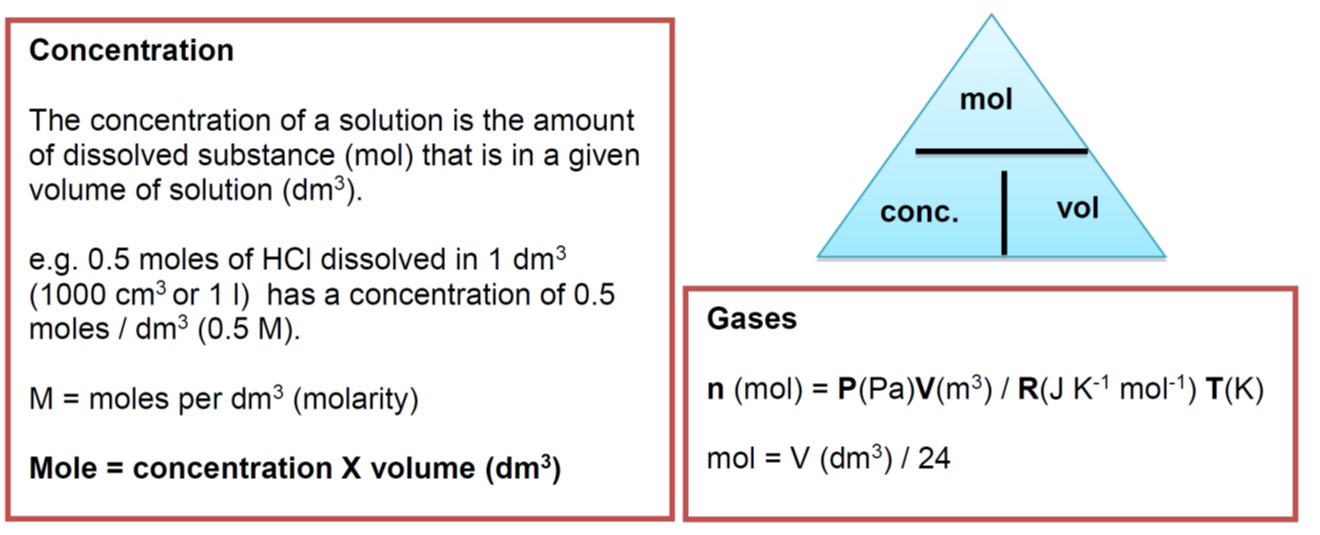 Not as clearly identified in the video is the method to quickly determine the volume of a gas when the number of moles is known. At r.t.p (room temperature & pressure, ~25C and 1 atm): volume (dm3) = mol x 24, and at s.t.p (standard temperature and pressure, = 0C and 1 atm): volume (dm3) = mol x 22.4