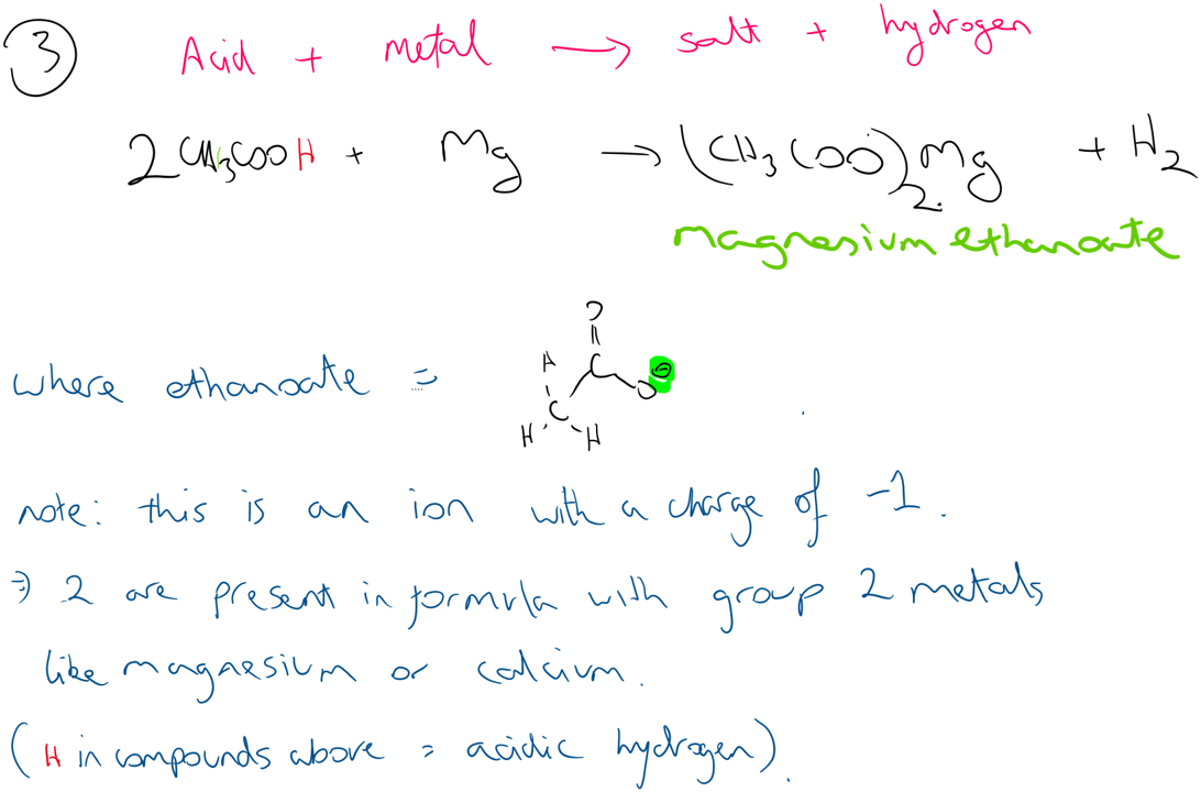 As they are acids they will react in the same way as standard acids, although not with the same intensity as they are weak acids. e.g. Ethanoic acid reacts with sodium hydroxide to form its salt (sodium ethanoate) and water. They can react with metals to form salt and hydrogen and react with metal carbonates to form a salt, carbon dioxide and water.