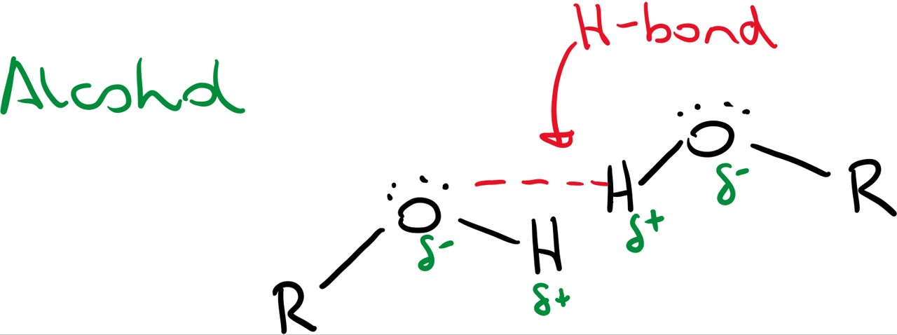 A Hydrogen bond (H-bond above) is an electrostatic attraction between an electron deficient hydrogen atom (one bonded to a suitably electronegative element, only nitrogen, oxygen or fluorine) and the lone pair on another atom, usually nitrogen, oxygen or flourine. This intermolecular attraction is far stronger than Van der Waals forces and is the reason that alcohols have reasonably high boiling point. As the chain length of the alcohol increases then the boiling point will also slightly increase as there are more Van der Waals forces of attraction.
