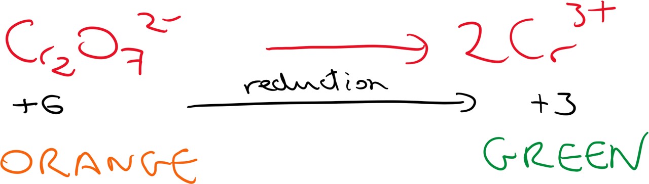 As the oxidising agent above is a dichromate ion, it has an orange colour, as it oxidises the alcohol, it itself gets reduced to chromium ions which are green. So the colour change for the reaction is orange-> green (note the counter ion 'Na+' in 'Na2Cr2O7' above is irrelevant, it could also be 'K+').