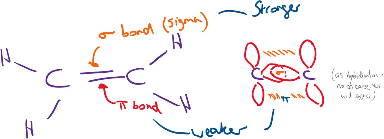 The two covalent bonds in the double bond are formed from a different orientation of orbital overlap. One of the bonds (sigma bond) arises from a head-on overlap of orbitals which results in a very strong covalent bond. The other bond (pi bond) however arises from a side-on overlap of orbitals (hybridisation is not covered in L.C. chemistry). This weaker bond results in the chemistry that they undergo, i.e. Addition reactions.