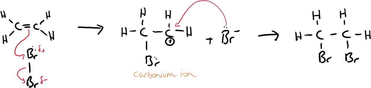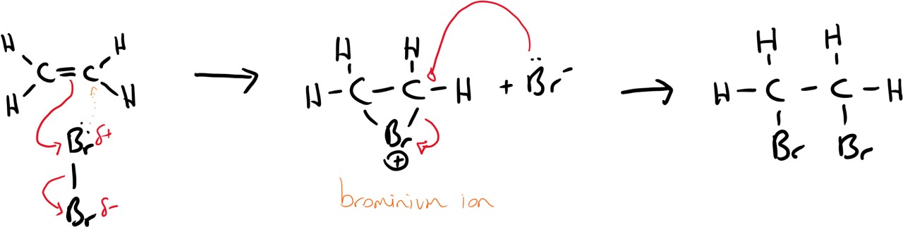 1) polarisation of bromine. electron rich nucleophile (nucleus loving) alkene attacks bromine.
