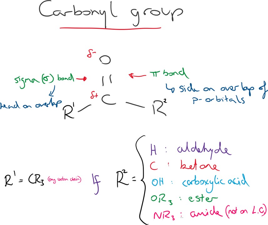There are 4 types of carbonyl that are examined in L.C. chemistry; aldehydes, ketones, carboxylic acids & esters.