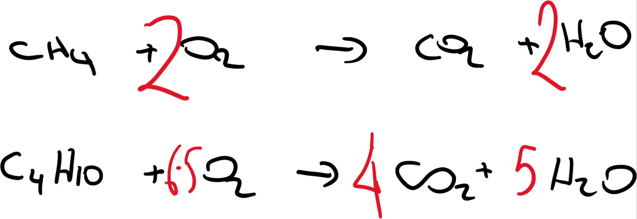 To balance combustion reactions always begin with balancing carbon, then hydrogen, then oxygen atoms.