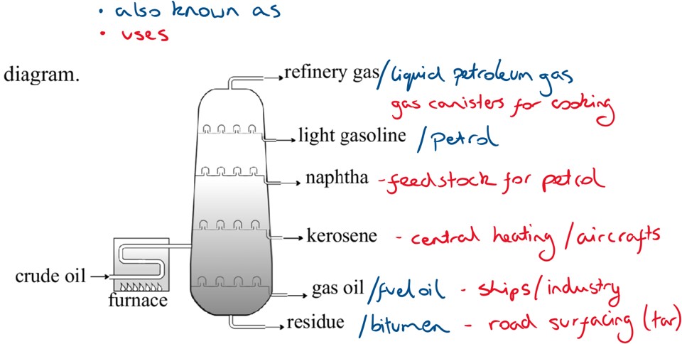 It is not very useful in its crude state so it gets purified using fractional distillation which is the separation of molecules into different fractions based on their boiling points. Longer chain hydrocarbons will have higher boiling points due to the increased Van der Waals forces holding the molecules close together.