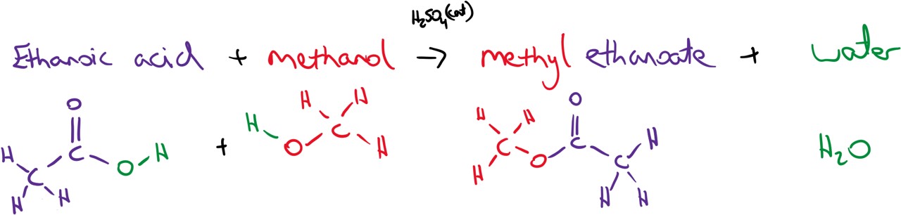 The main reactions that are necessary to know for L.C. chemistry is the reaction with an acid to form an ester in a substitution reaction (see ester section below), the dehydration of an alcohol to from an alkene in an elimination reaction (see alkene formation) and the oxidation of alcohols to form aldehydes, ketones or carboxylic acids.