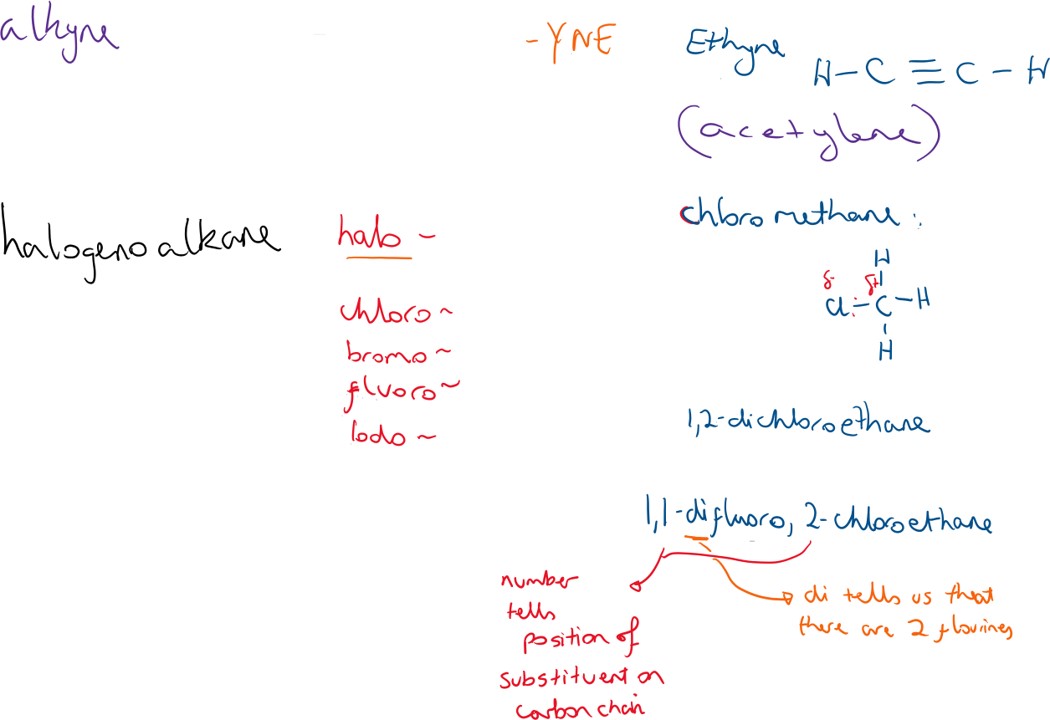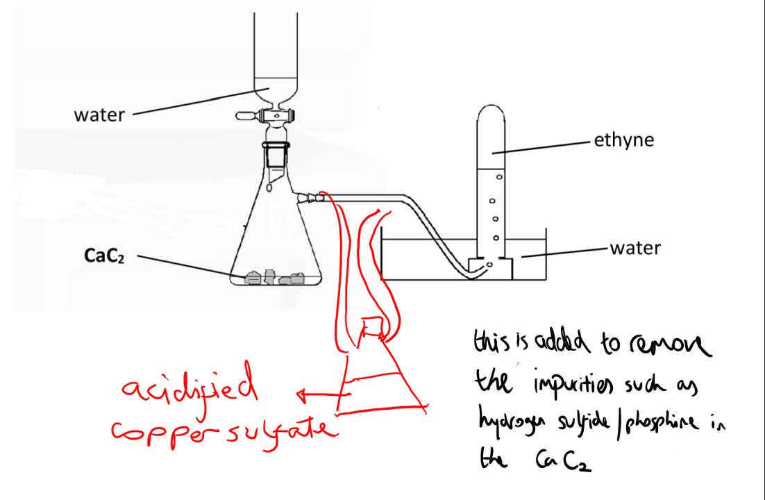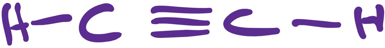 Alkynes are hydrocarbons that have a carbon-carbon triple bond. The only one on the L.C. course is the first member, ethyne, also known as acetylene ( used in blow torches for welding). The formation of ethyne from water being dropped onto calcium carbide is a popular question.
