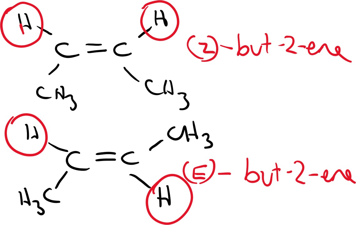 While not on the course, the last point to mention about alkenes is the fact that you can get geometrical stereoisomers. Stereoisomers are molecules whose atoms are connected in the same way but have a different arrangement in space. Geometrical ones have groups attached to different sides of the double bond. e.g.: