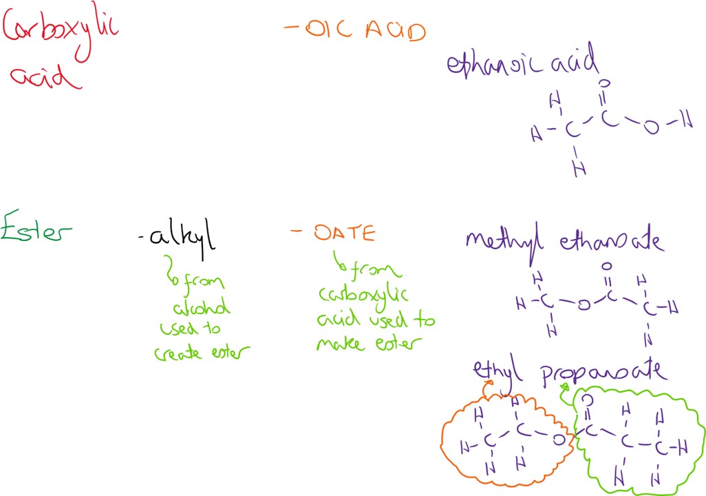 There are two parts to their name, the first always comes from the alkyl part of the alcohol and the second comes from the carboxylic acid used to make them.