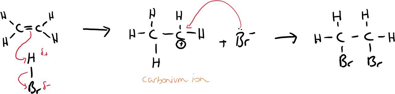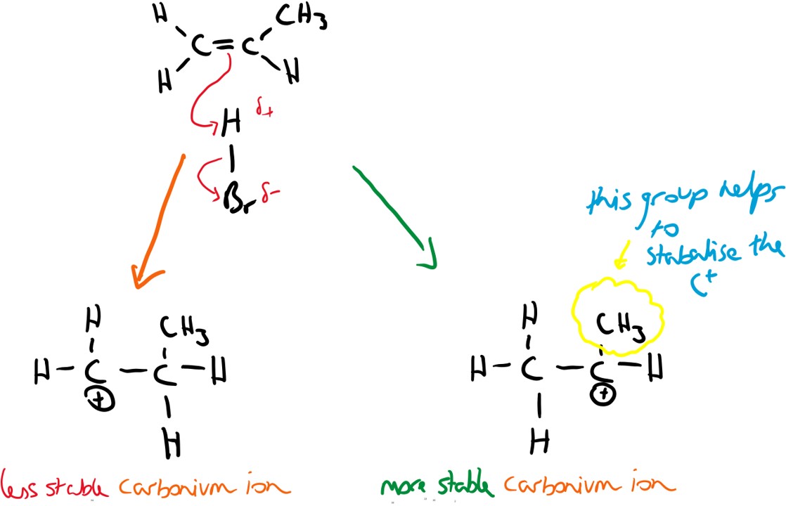 N.B.: if the alkene is unsymmetrical then the carbocation (C+) forms on ion the carbon atom that has the larger number of electron rich atoms (i.e. non-hydrogen atoms for simplicity). eg