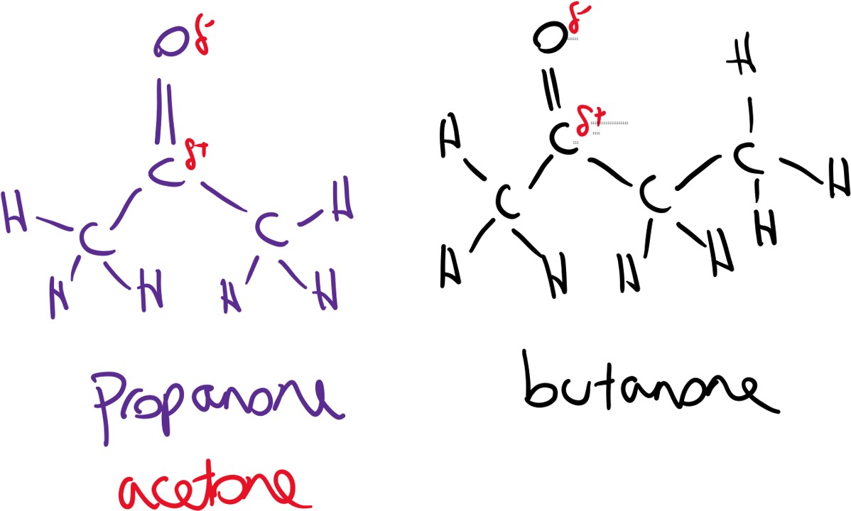 Ketones are much like aldehydes but the carbonyl group is 'internal' and not on the end of a carbon chain. Hence the smallest ketone is propanone (3 carbon atoms), that and butanone are the only ones on the L.C. course. Their physical properties and chemical reactions are similar to aldehydes. They can be reduced to alcohols using Hydrogen and a Nickel catalyst, which is also used to make alkanes from alkenes (this reduction of carbonyls is more popular on the mark schemes than the usual sodium borohydride or lithium aluminium hydride).