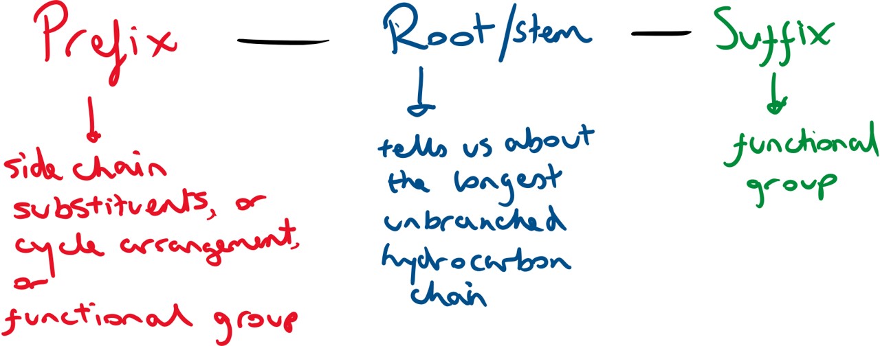 This is a naming system for organic compounds created by the International Union of Pure and Applied Chemistry (IUPAC). The name can consist of three parts, although not all three are always necessary.