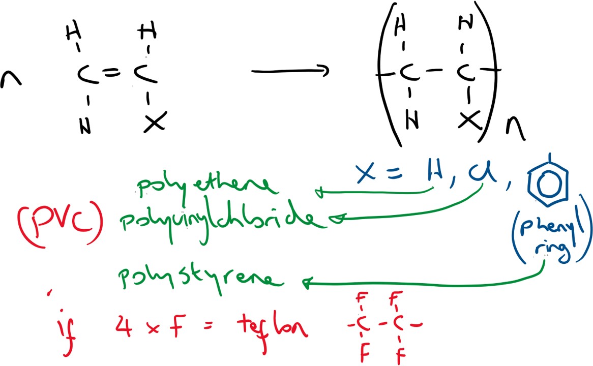 Addition polymerisation: Double bond breaks and a new carbon-carbon single bond forms. Under certain conditions, alkenes (monomers) can undergo polymerisation reactions with themselves to form very long chain molecules known as polymers.
