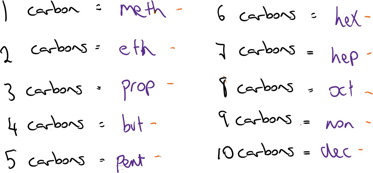 The root of the name depends on the number of carbons in the longest unbranched chain of carbon atoms. e.g. If a molecule has one carbon and it is from the alkane family then it must be methane (see homologous series below).