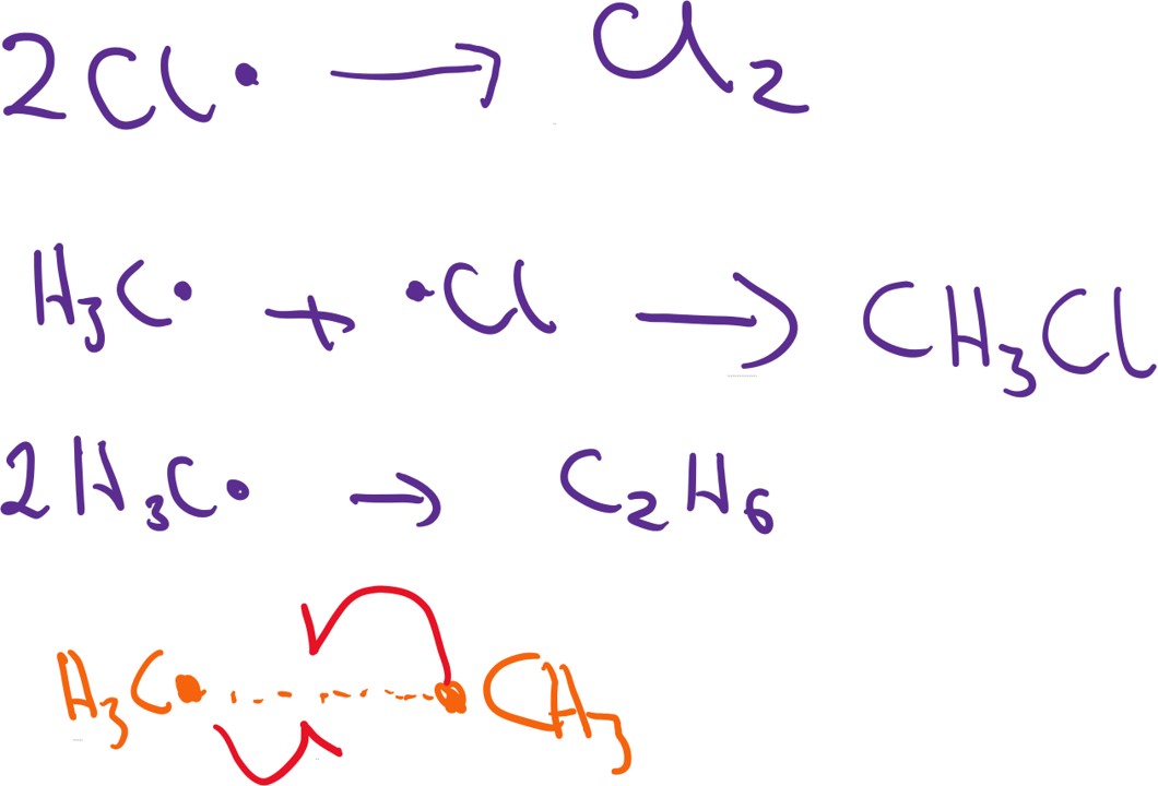 There are three potential termination steps; essentially a radical must react with another radical so that no new radical is formed. 2 things are worth noting here.